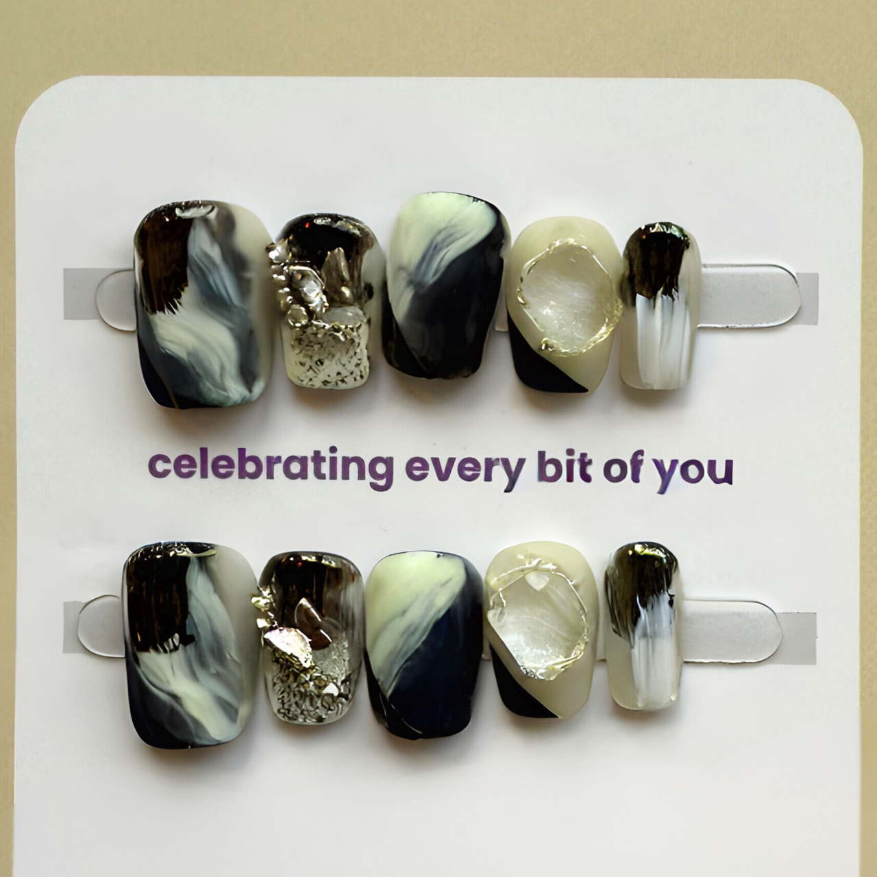Black and deep brown blend with an iridescent silver glow in Silver Tide press-on nails. Shimmery, fluid, and futuristic, this set feels like waves crashing under neon lights, made for the girl who turns every look into a moment.