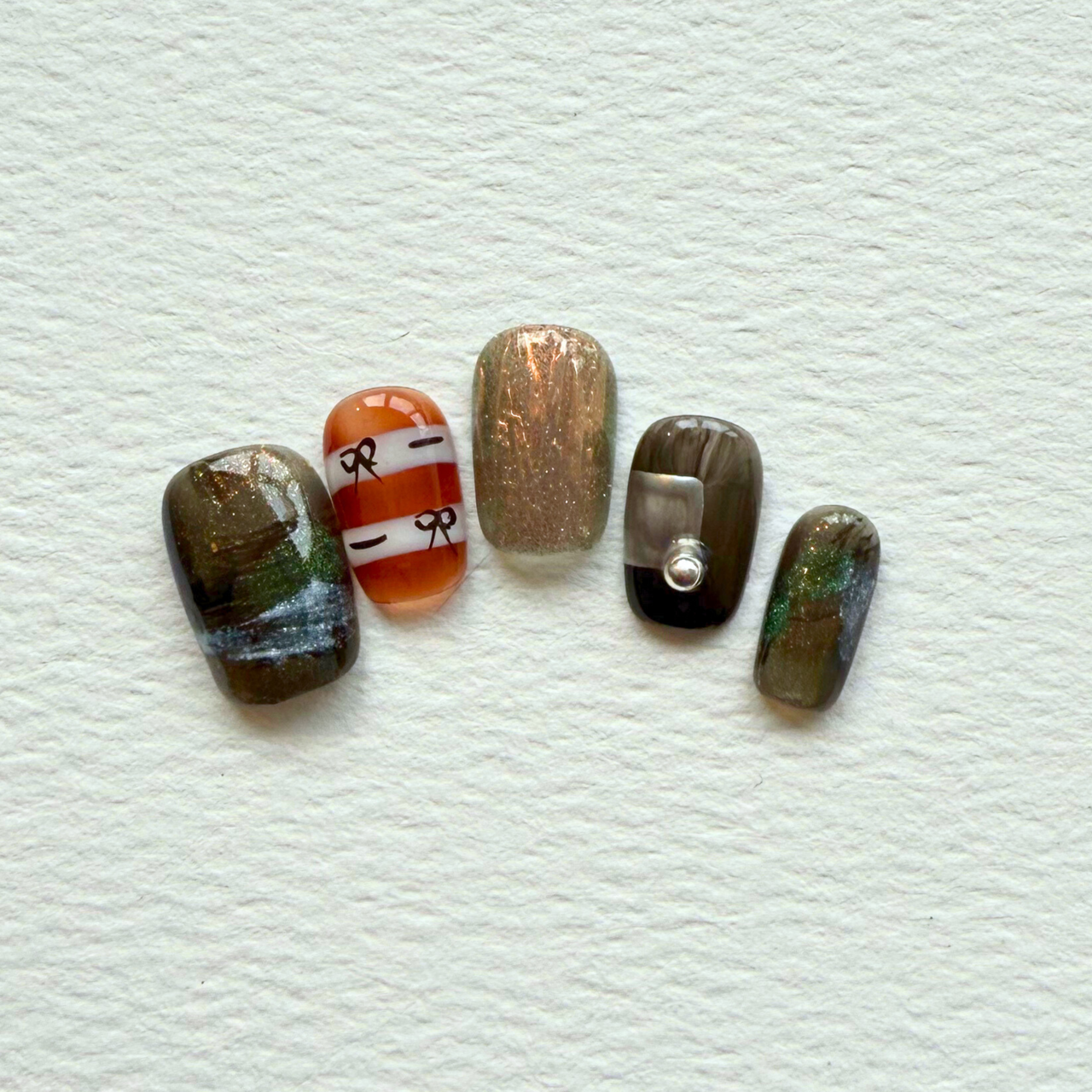 Shimmery brown-green meets amber stripes with bold bow details in Static Shimmer press-on nails. Loud, offbeat, and unapologetically Y2K, this set turns weird into wow for the girl who lives to stand out.