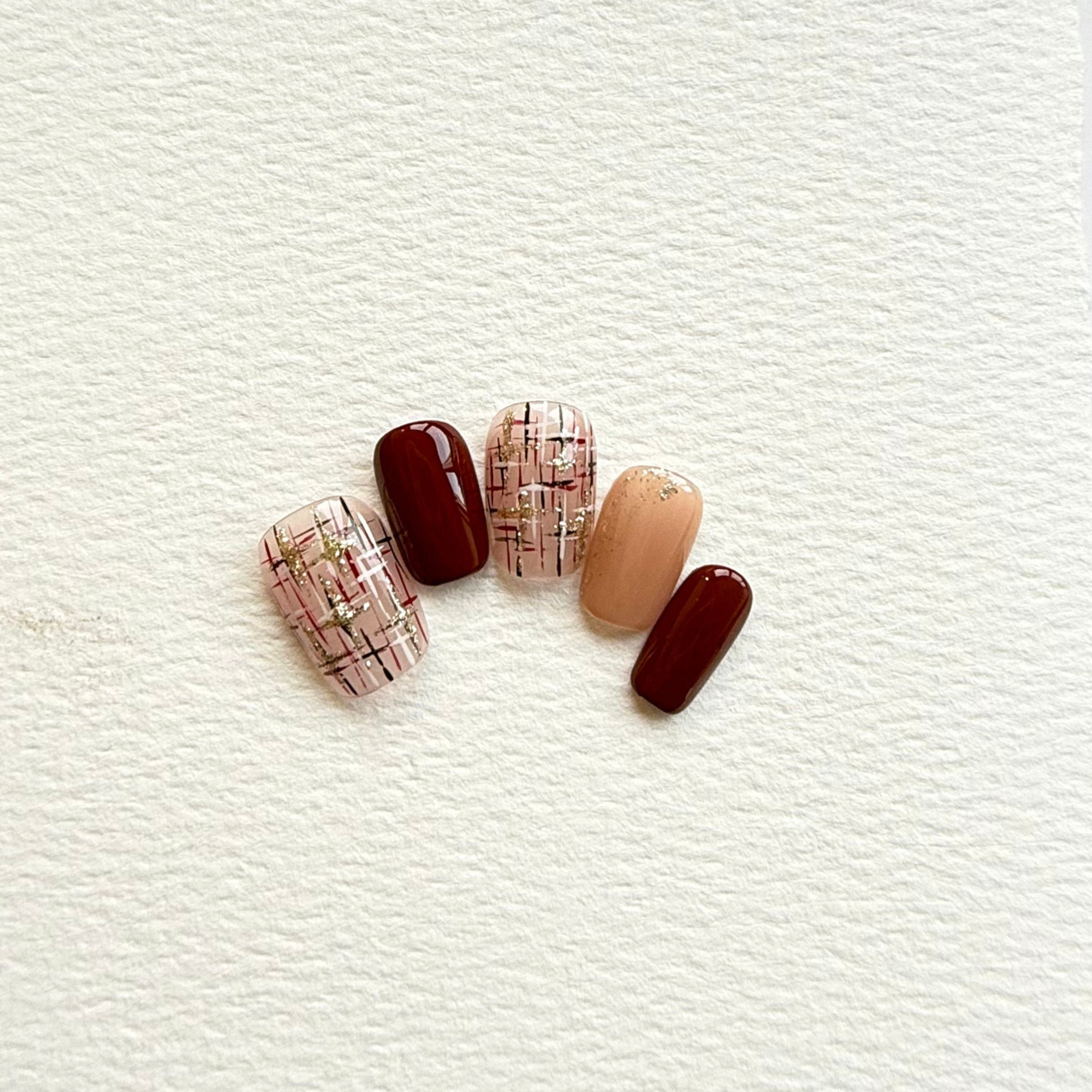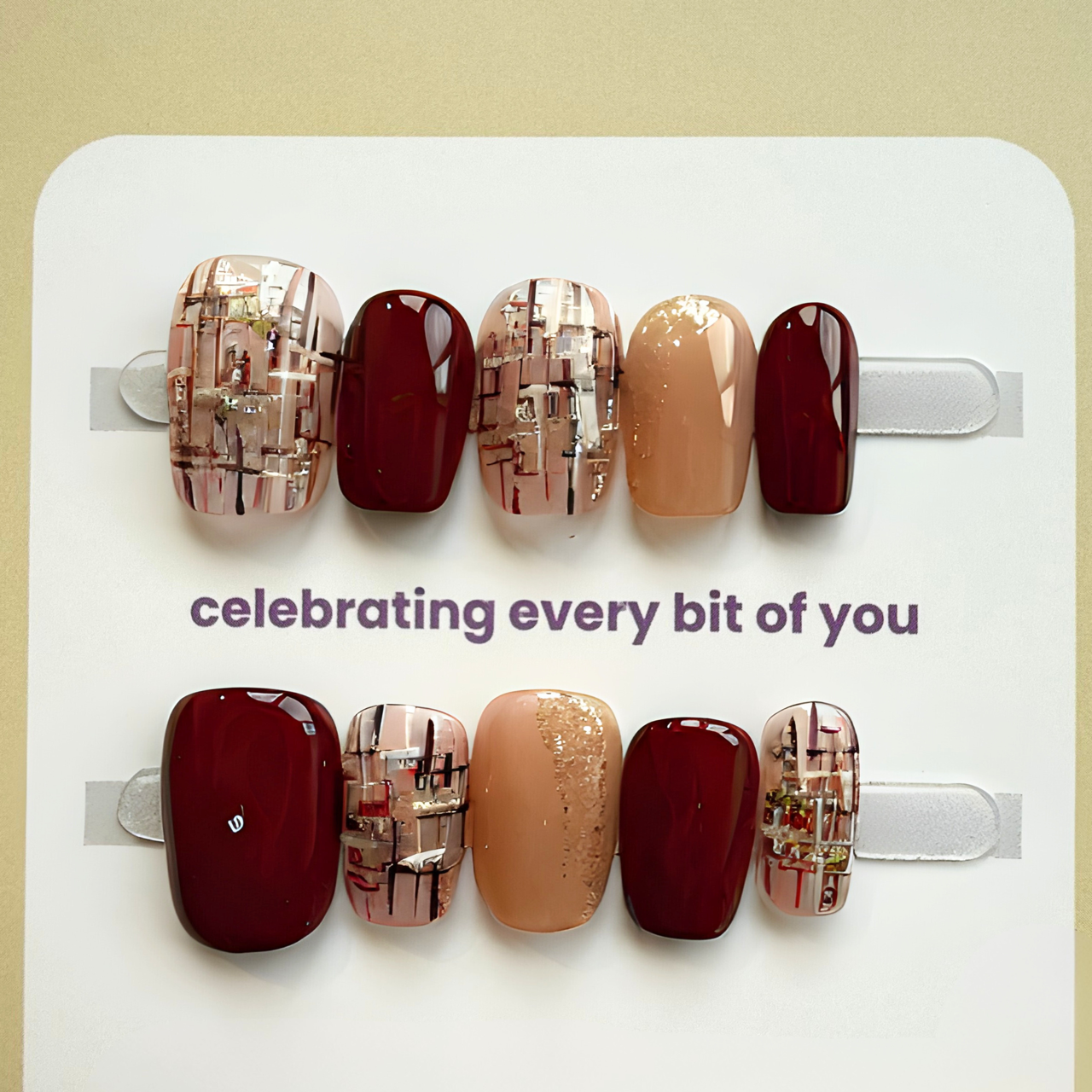 A mix of deep maroon and soft peach, Tweed Crush press-on nails channel that timeless jacket vibe. Polished, flirty, and just the right amount of preppy chic.